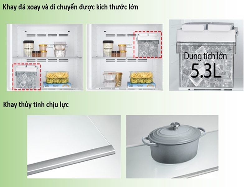 Khay đá có thể di chuyển, tháo rời giúp tận dụng không gian lưu trữ hiệu quả và thuận tiện. Hộp đá lớn dung tích 5.3L rất tiện lợi khi tổ chức các bữa tiệc. Khay thủy tinh chịu lực chịu nhiệt và dễ dàng lau chùi, chịu sức nặng lên tới 100kg.
