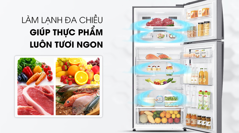 Hệ thống khí lạnh đa chiều cho phép hơi mát được thoát ra từ nhiều vị trí khác nhau, phân phối hài hòa, lan tỏa đồng đều đến mọi ngóc ngách trong tủ. Nhờ đó, thực phẩm sẽ luôn được “đắm mình” trong không gian mát lạnh, tránh tình trạng hư hỏng để mang đến bữa ăn tuyệt vời cho cả gia đình.