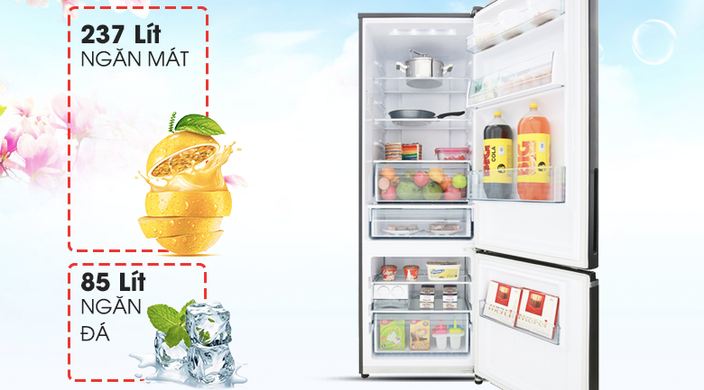 Có dung tích lên đến 322 lít cùng cách sắp xếp ngăn tủ hợp lý, cho bạn thêm nhiều không gian để bảo quản thực phẩm cho gia đình. Tủ lạnh này khá phù hợp cho gia đình có từ 3 – 4 người sử dụng.