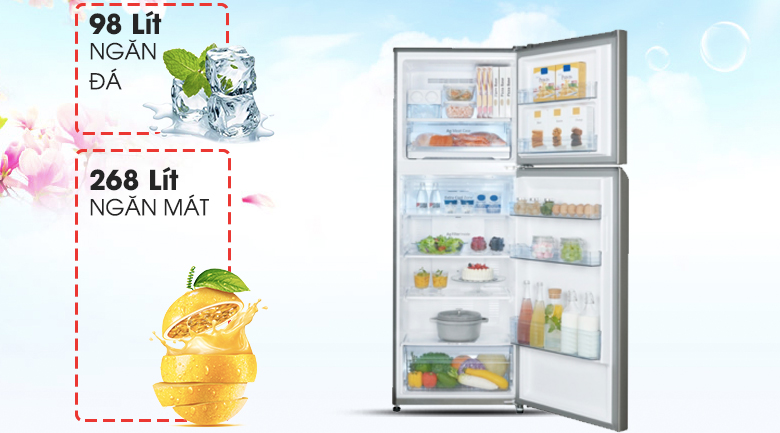 Chiếc tủ lạnh ngăn đá trên này có dung tích 366 lít, với 98 lít cho ngăn đá, 268 lít cho ngăn lạnh, giúp bạn thoải mái bảo quản thực phẩm với khối lượng lớn. Tủ rất thích hợp sử dụng cho gia đình đông người, có từ 3 – 4 thành viên.