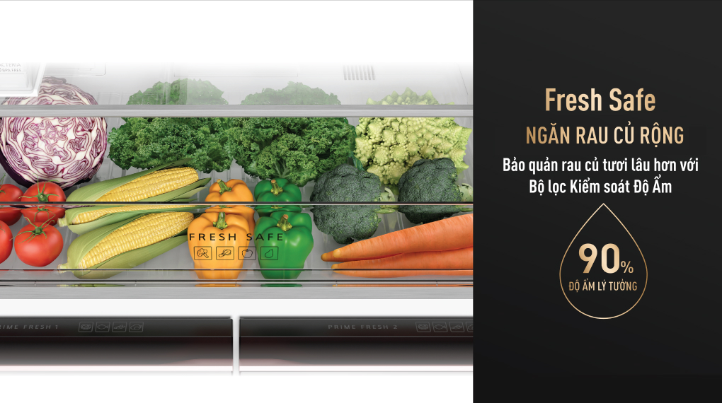 – Ngăn rau củ kép Fresh Safe với bộ lọc kiểm soát độ ẩm là tính năng cung cấp khả năng quản lý độ ẩm tối ưu trong ngăn chuyên biệt dành cho rau củ. Đây là một môi trường lý tưởng giúp bảo quản trái cây và rau củ luôn tươi xanh và kéo dài thời gian lưu trữ của chúng.