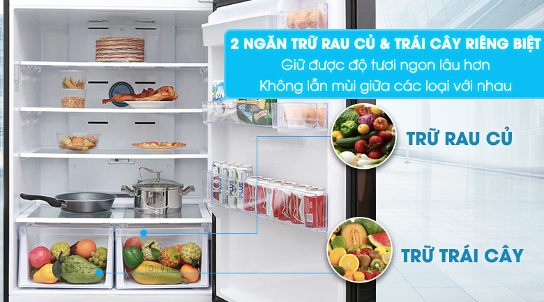 Tủ lạnh thông thường chỉ có một ngăn chung để bảo quản rau củ và trái cây. Tuy nhiên tủ lạnh Inverter này lại được trang bị 2 ngăn chứa riêng biệt cho rau củ và trái cây, cho phép bạn dễ dàng phân loại để bảo quản, giúp rau củ, trái cây được tươi ngon lâu hơn.