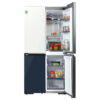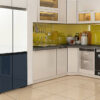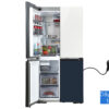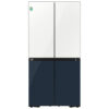 Tủ lạnh Samsung Inverter 599 lít RF60A91R177/SV có thiết kế 4 cửa kiểu Pháp sang trọng, kết hợp với mặt kính Glam Glass đầy tinh tế cùng tông màu trắng – xanh Navy hiện đại tạo điểm nhấn cho không gian bếp.