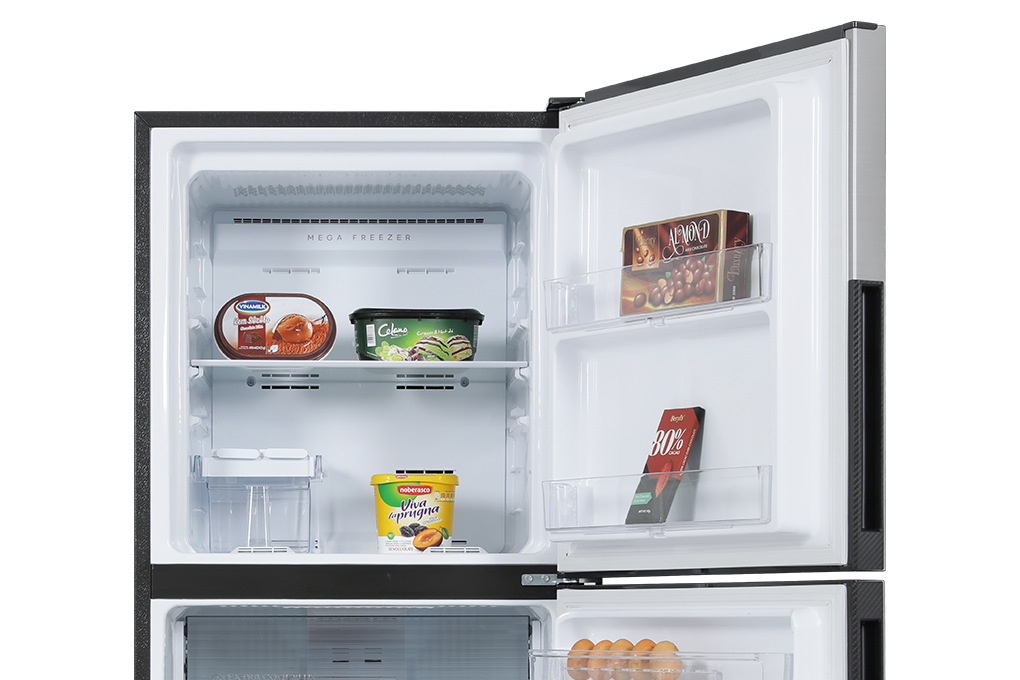 – Phần ngăn đá có một kệ khay đá để ngăn ra làm đôi, tiện lợi hơn trong quá trình bảo quản và sắp xếp thực phẩm. Có hộp đá xoay có thể dễ dàng làm các viên đá nhỏ và bỏ ra ngoài khi cần tăng không gian lưu trữ. Phần cánh tủ có thêm khay đựng để đồ tiện lợi.