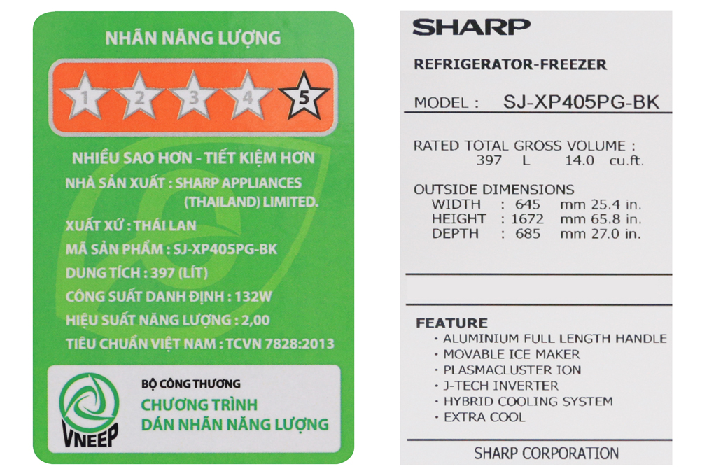 Tủ lạnh Sharp Inverter 364 lít SJ-XP405PG-BK có thiết kế tủ 2 cánh với kiểu tủ truyền thống, ngăn đá trên, ngăn mát nằm dưới. Sản phẩm có màu sắc tinh tế, cùng mặt gương phía trước phù hợp lắp đặt trong mọi không gian nội thất nhà bếp.