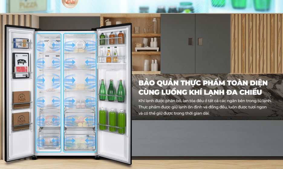 - Công nghệ làm lạnh đa chiều: Công nghệ này sẽ lan tỏa đều hơi lạnh khắp mọi ngăn tủ, giúp thực phẩm được làm lạnh toàn diện để giảm thiểu tình trạng hư hỏng, đồng thời kéo dài thời gian bảo quản lâu hơn. Không chỉ phân bố luồng khí lạnh đồng đều, tủ lạnh còn trang bị tấm nhôm phía sau (bên trong tủ) với nhiệt độ không đổi 0 độ C, kết hợp quạt làm lạnh trên khoang thổi các khí lạnh đi đồng đều, duy trì tối ưu độ ẩm và nhiệt độ.