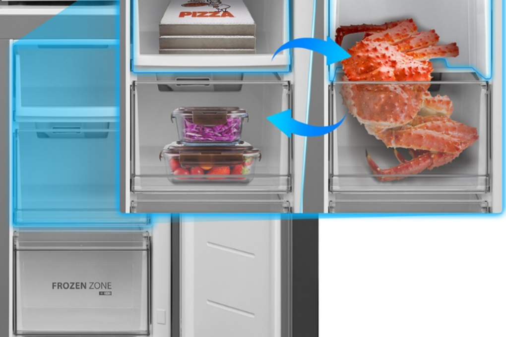 – Thiết kế có hộc chứa riêng biệt giúp lưu trữ thực phẩm đông lạnh hiệu quả, ngăn lẫn mùi thực phẩm.
