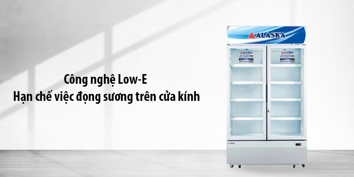 Công nghệ Low-E giúp giảm lượng tia nhiệt và tia tử ngoại xâm nhập qua cửa kính. Tủ mát Alaska công nghệ Low-E có khả năng phản chiếu nhiệt trở lại trong phòng, từ đó duy trì nhiệt độ bên trong ổn định và giúp tiết kiệm năng lượng.