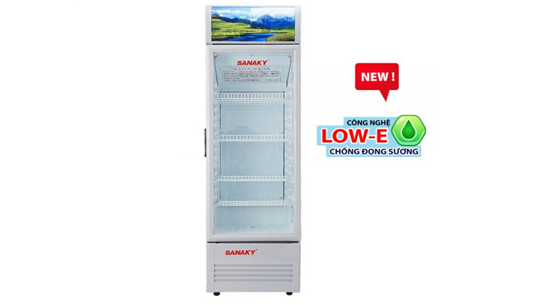 Cửa kính trong suốt với công nghệ LOW-E phản xạ nhiệt, chống tia cực tím: Làm giảm sự phát tán, hấp thụ nhiệt và ngăn chặn tia cực tím làm ảnh hưởng đến thực phẩm bảo quản trong tủ. Cùng với đó nó cũng giúp tăng khả ăng giữ nhiệt, ngăn chặn và làm giảm sự truyền nhiệt từ ngoài vào trong tủ hay từ trong tủ ra môi trường bên ngoài, giúp giảm điện năng tiêu thụ. Kết hợp với hệ thống sưởi kính từ lốc nén giúp hạn chế tối đa tình trạng đọng sương trên cánh kính.