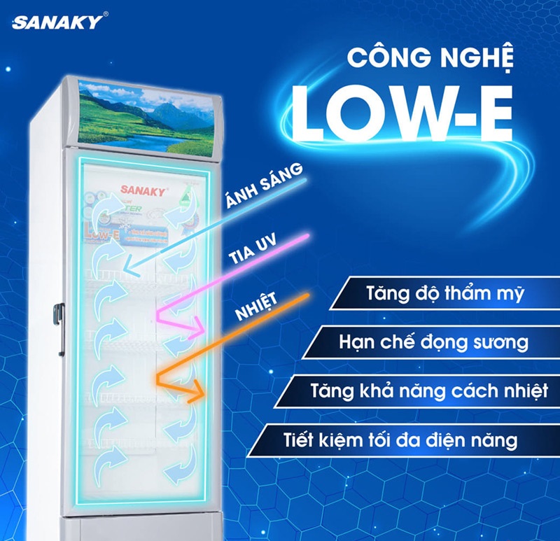 Công nghệ Low-E sẽ hạn chế tia hồng ngoại mang nhiệt và tia UV năng lượng cao của ánh sáng trắng thâm nhập vào tủ. Kính hạn chế đọng sương hay hơi nước trên cánh tủ khi tủ đang hoạt động nhờ nâng cao khả năng cách nhiệt của kính. Bên cạnh đó kính còn giúp cân bằng ánh sáng tốt hơn, không gây chói mắt khi nhìn từ ngoài vào tủ mà có ánh đèn hay nguồn ánh sáng khác chiếu vào mặt kính. Nâng cao tính thẩm mỹ cánh tủ, giúp tối ưu cho mục đích trưng bày sản phẩm.