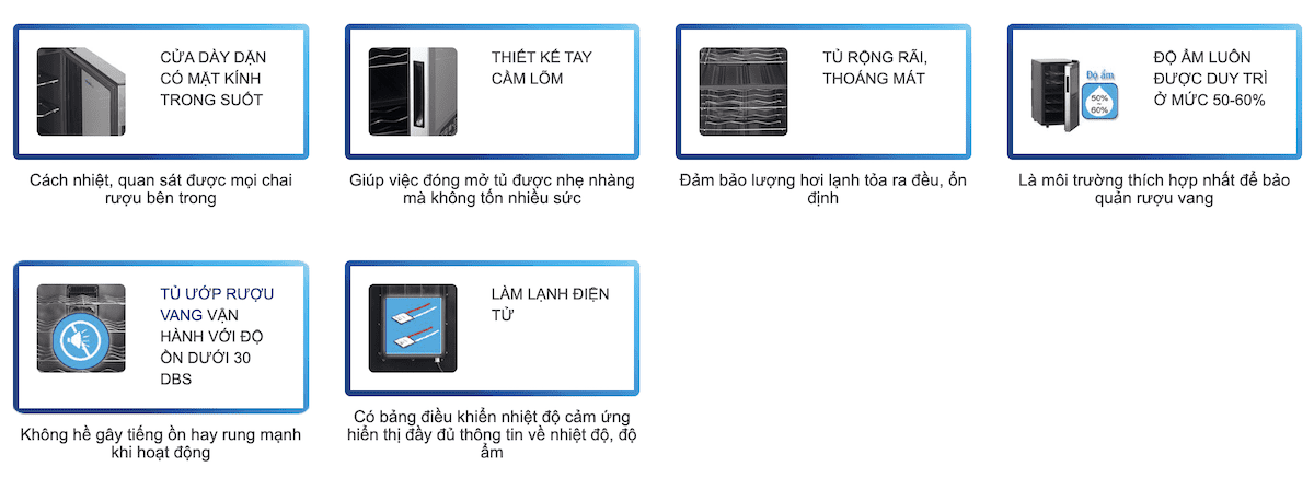 – Ngoài ra tủ còn có bộ lọc than hoạt tính giúp lọc sạch không khí bên trong tủ, chống nấm mốc, vi khuẩn, và bộ chống rung giúp giữ ổn định các chai rượu trên khay chứa. Tủ giữ lạnh được khoảng 5-8 tiếng sau khi mất điện, nếu không có tác động mở cửa tủ.