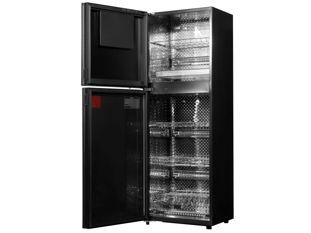 - Tầng trên với công nghệ khử trùng đồ dùng bếp bằng ozone và tia UV (có thể tùy chỉnh thời gian khử trùng và làm ấm chén đĩa).