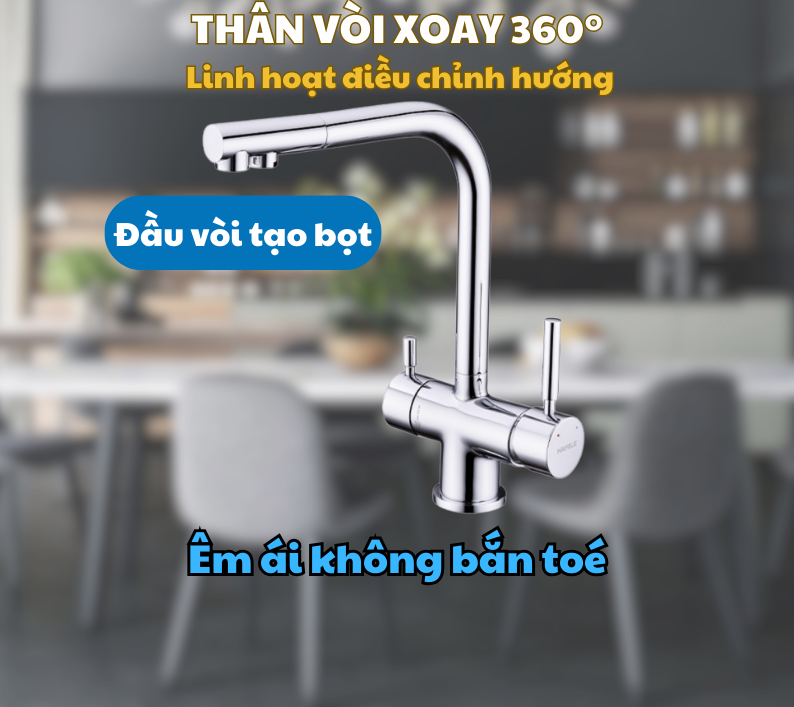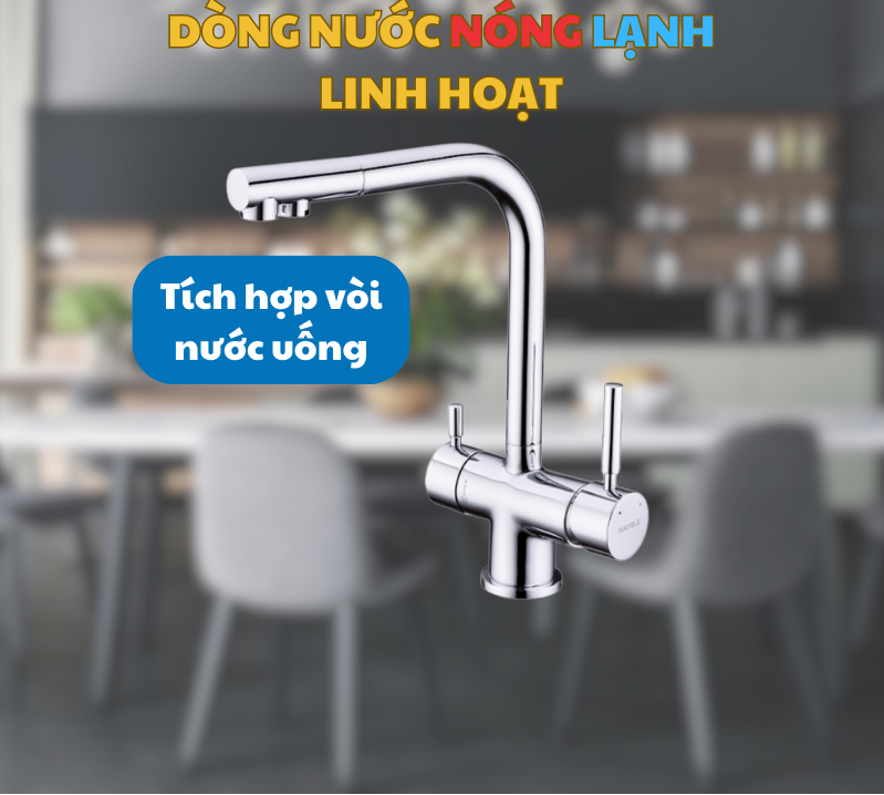 Điểm nổi bật của mẫu vòi này là thiết kế đầu vòi riêng biệt cho nước uống, giúp bạn dễ dàng lấy nước uống trực tiếp từ vòi mà không bị pha lẫn với nguồn nước sinh hoạt – tiện lợi, vệ sinh và an toàn cho sức khỏe.