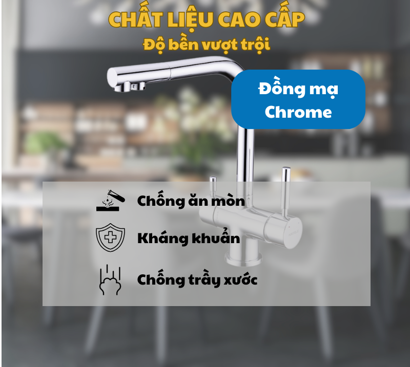 Với công nghệ mạ hiện đại, bề mặt vòi luôn sáng bóng, sạch sẽ, không dễ trầy xước, giúp không gian bếp thêm sang trọng và chuyên nghiệp.