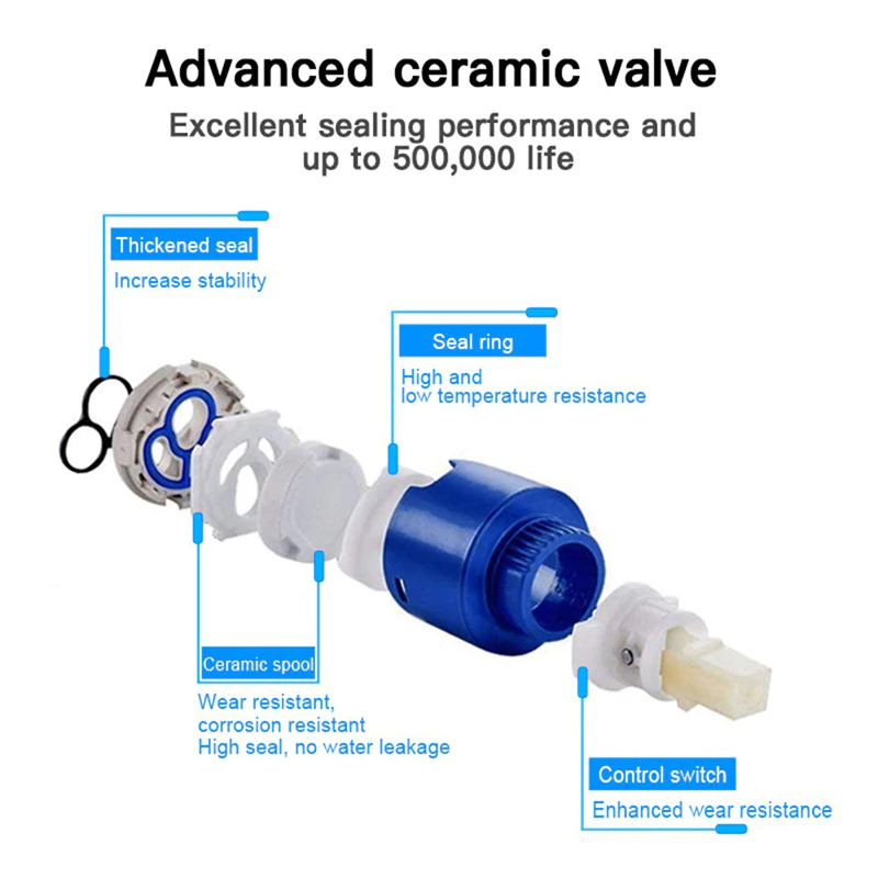 Lõi trộn nóng lạnh cao cấp: Lõi vòi nhập khẩu cao cấp có khả năng chịu nhiệt và áp lực nước tốt nên mang lại độ bền cao, có thể sử dụng đến 500.000 lần đóng mở với tần suất liên tục.