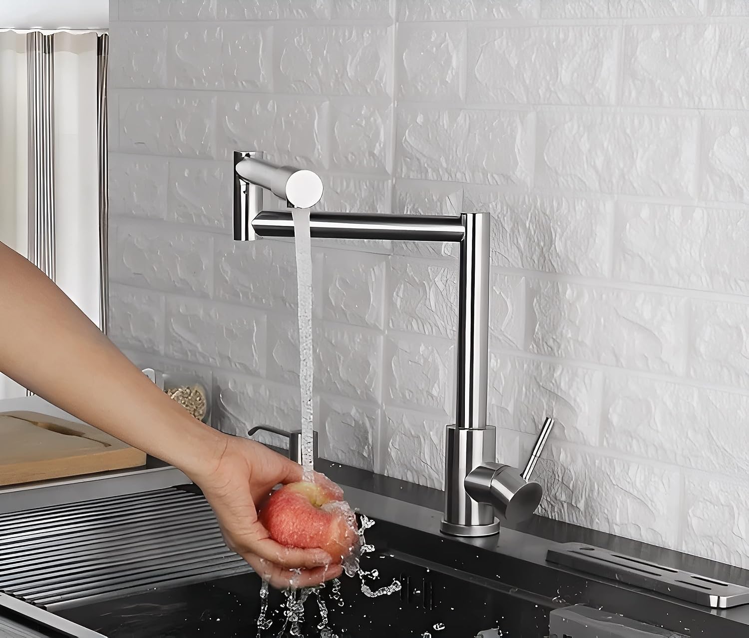 - Kiểu dáng gấp khúc lạ mắt, tạo vẻ đẹp cá tính và ấn tượng cho khu vực bồn rửa, thân vòi dài với phạm vi làm việc rộng, có thể vươn đến mọi ngóc ngách ở xa.