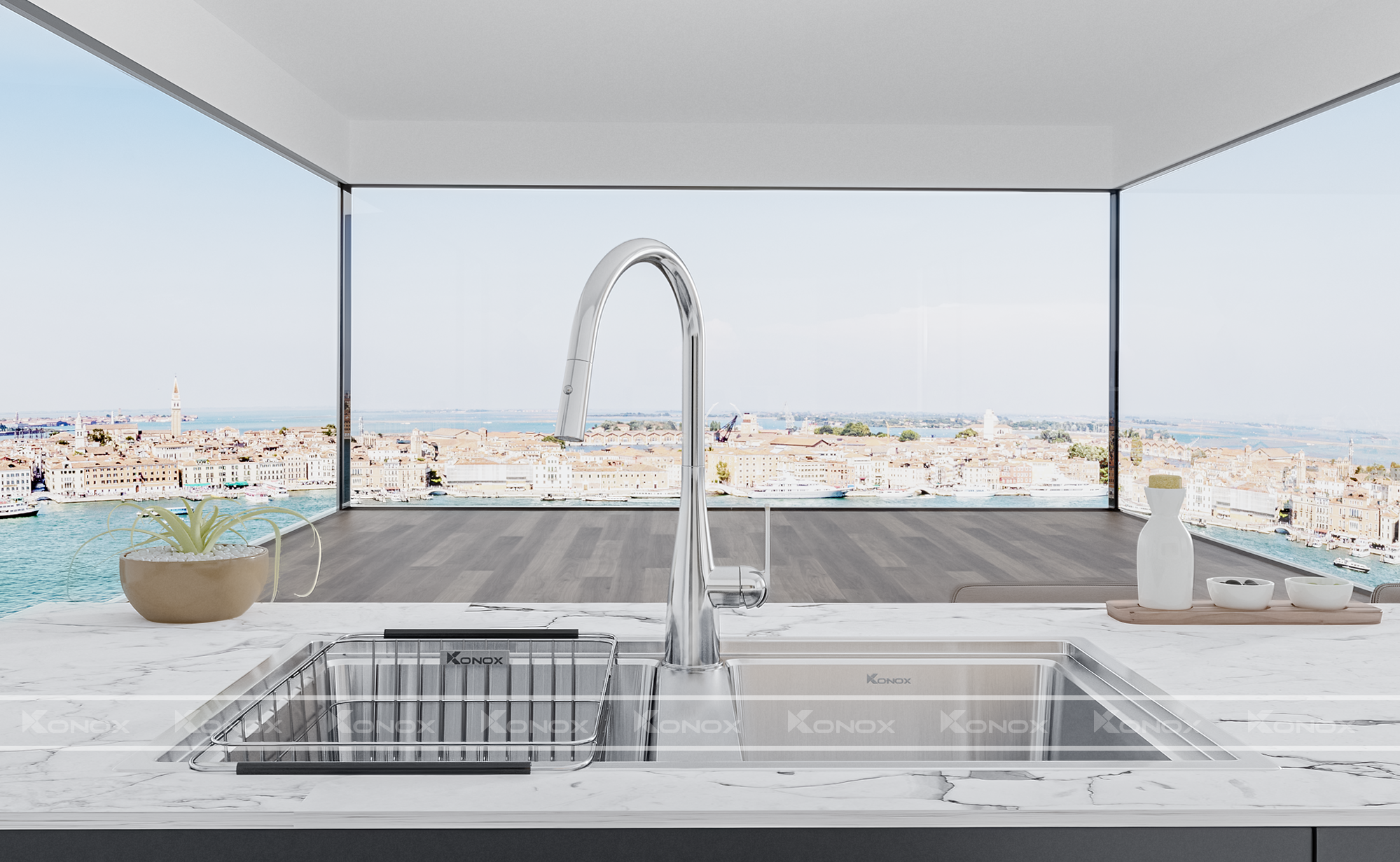 - Bề mặt vòi rửa Konox Curva Chrome mạ sáng bóng bền lâu, chống bám vân tay với công nghệ mạ PVD Chrome 5 lớp